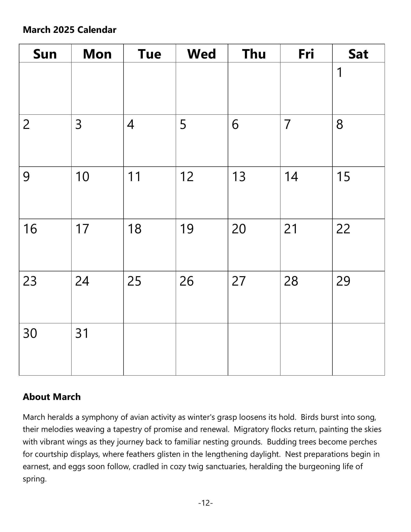 Welcome to the “2025 Birds Calendar,” where each month reveals the enchanting world of birds. From January’s “Melodic Chirping” to December’s “Unique Plumage,” this calendar celebrates our feathered friends in all their glory. February’s “Feathers’ Vibrancy” washes away winter gloom with a burst of color. March highlights “Wings’ Grace,” capturing elegance in every flap.