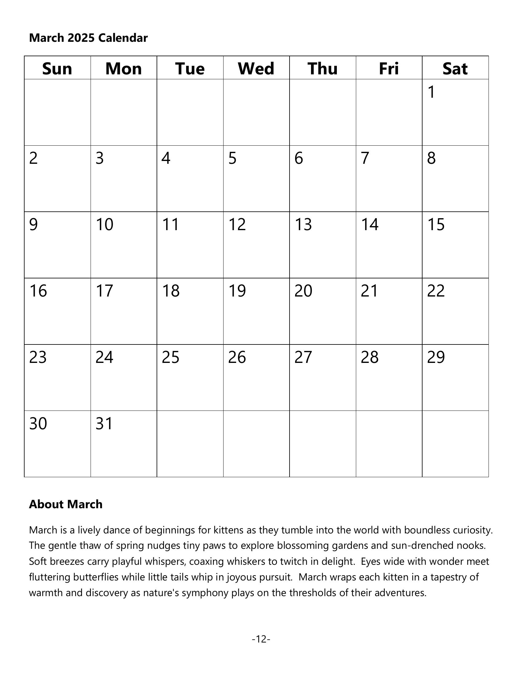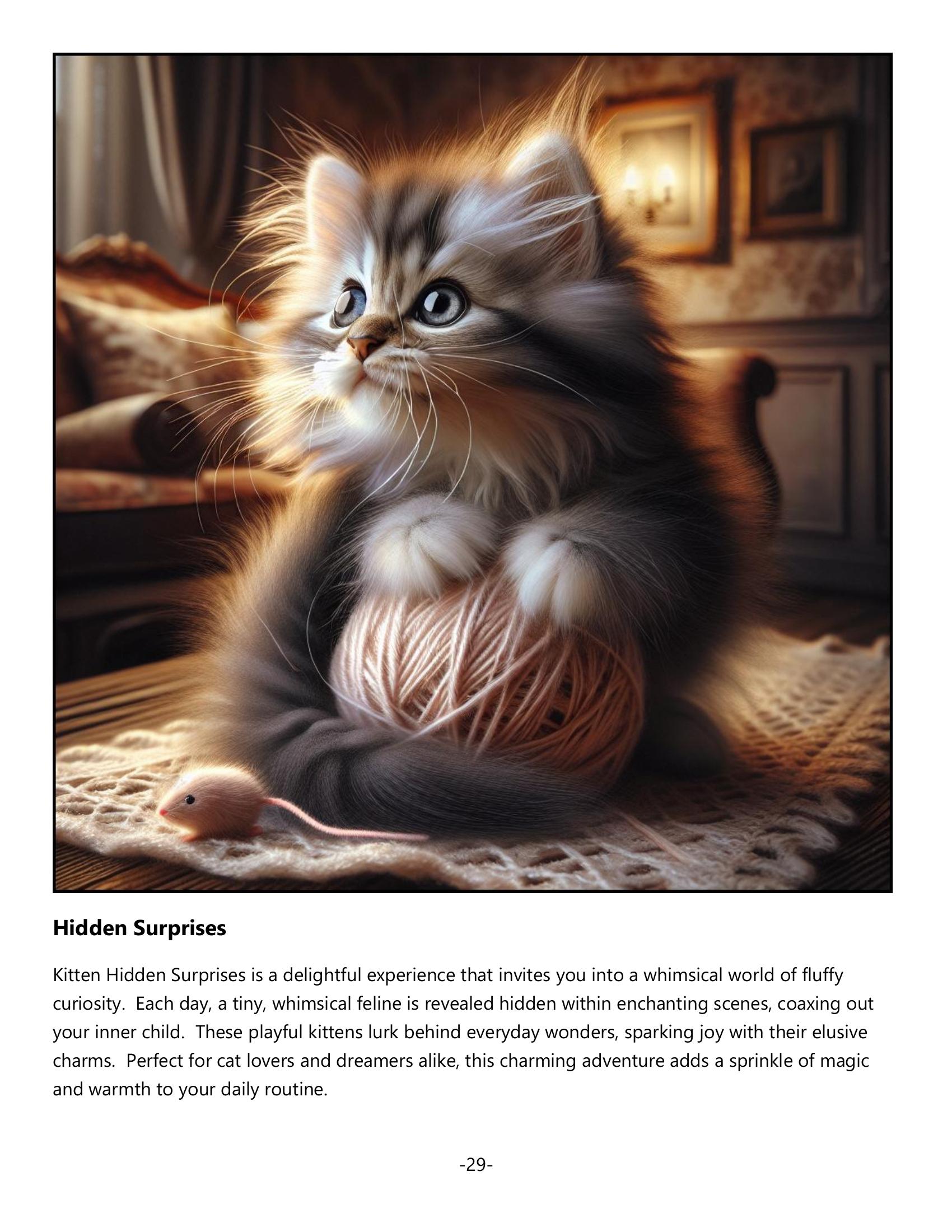 July’s pages twitch with whiskered intrigue, unveiling kitten mysteries, while August embraces moments of warm cuddles. September delights with hidden surprises in new adventures, and October highlights curious eyes reflecting autumn’s magic. November applauds tiny, daring paws, with December wrapping the year in love and laughter.