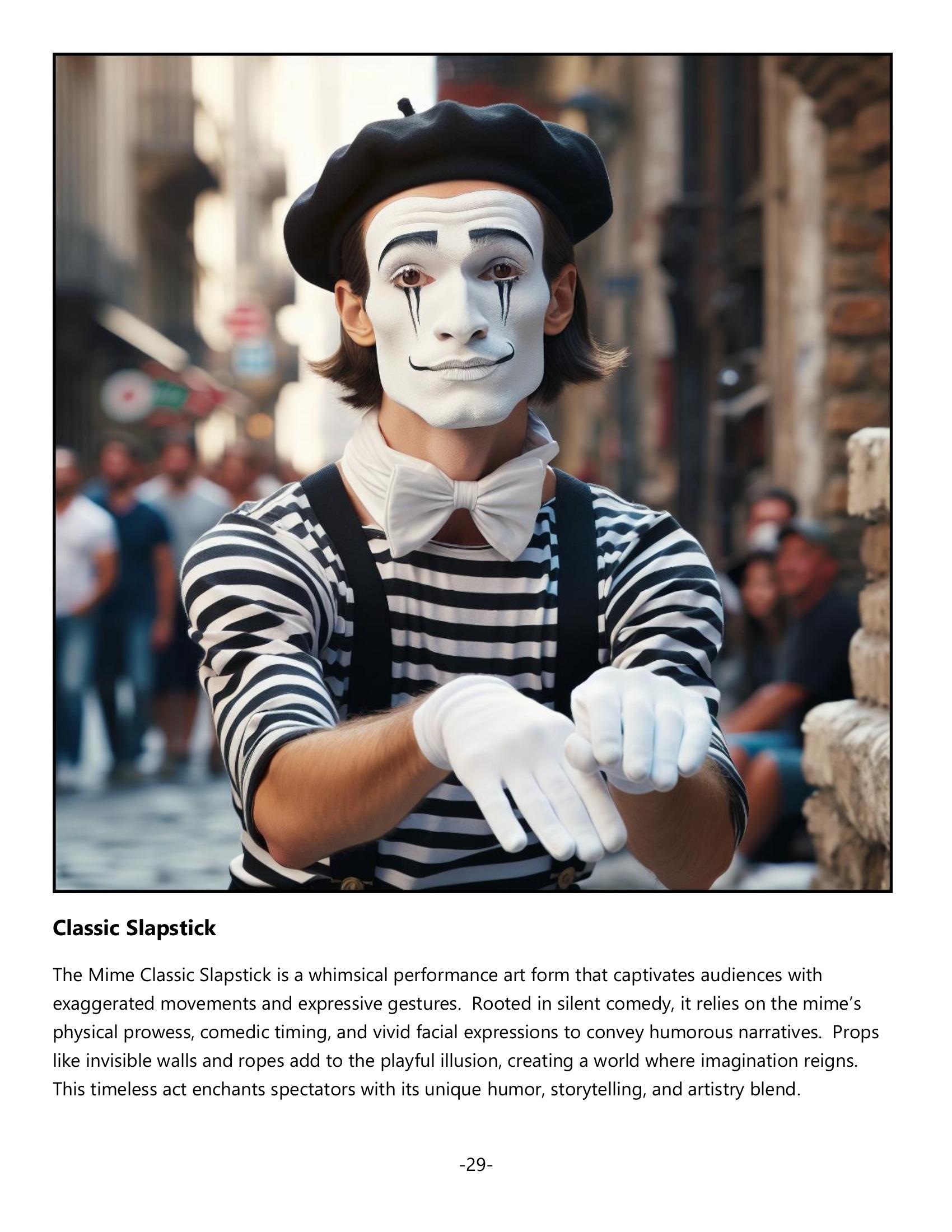 Celebrate the universal language of wordless communication—a tribute to silent interaction as touching as laughter and as poignant as the heart’s deepest sentiments. Relive timeless slapstick as mimes convey humor and pathos through expressive gestures, seamlessly connecting with audiences.