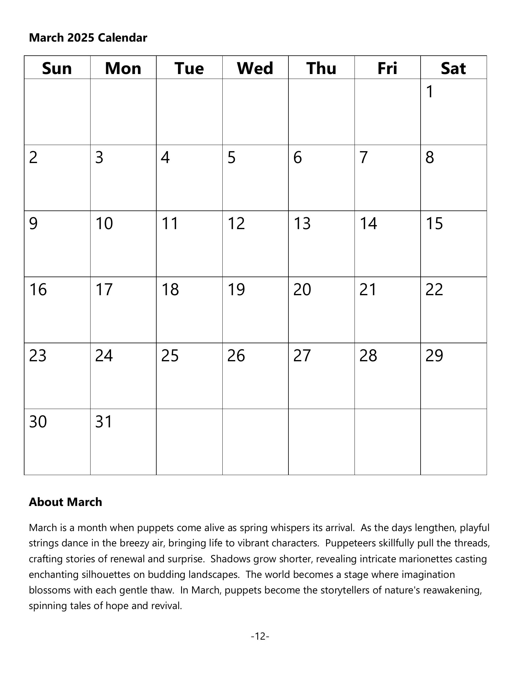 Immerse yourself in a captivating world where art and imagination merge in the enchanting dance of puppetry. Each month reveals a new puppet masterpiece—from January’s “Silent Storyteller,” sharing ancient tales, to December’s “Wooden Companion,” a guardian of dreams. This calendar is a delightful journey for creative souls, theater lovers, educators, and collectors, offering a colorful exploration of storytelling magic. Discover puppetry’s charm and cultural richness through vivid illustrations that capture the heart of these expressive, animated characters.