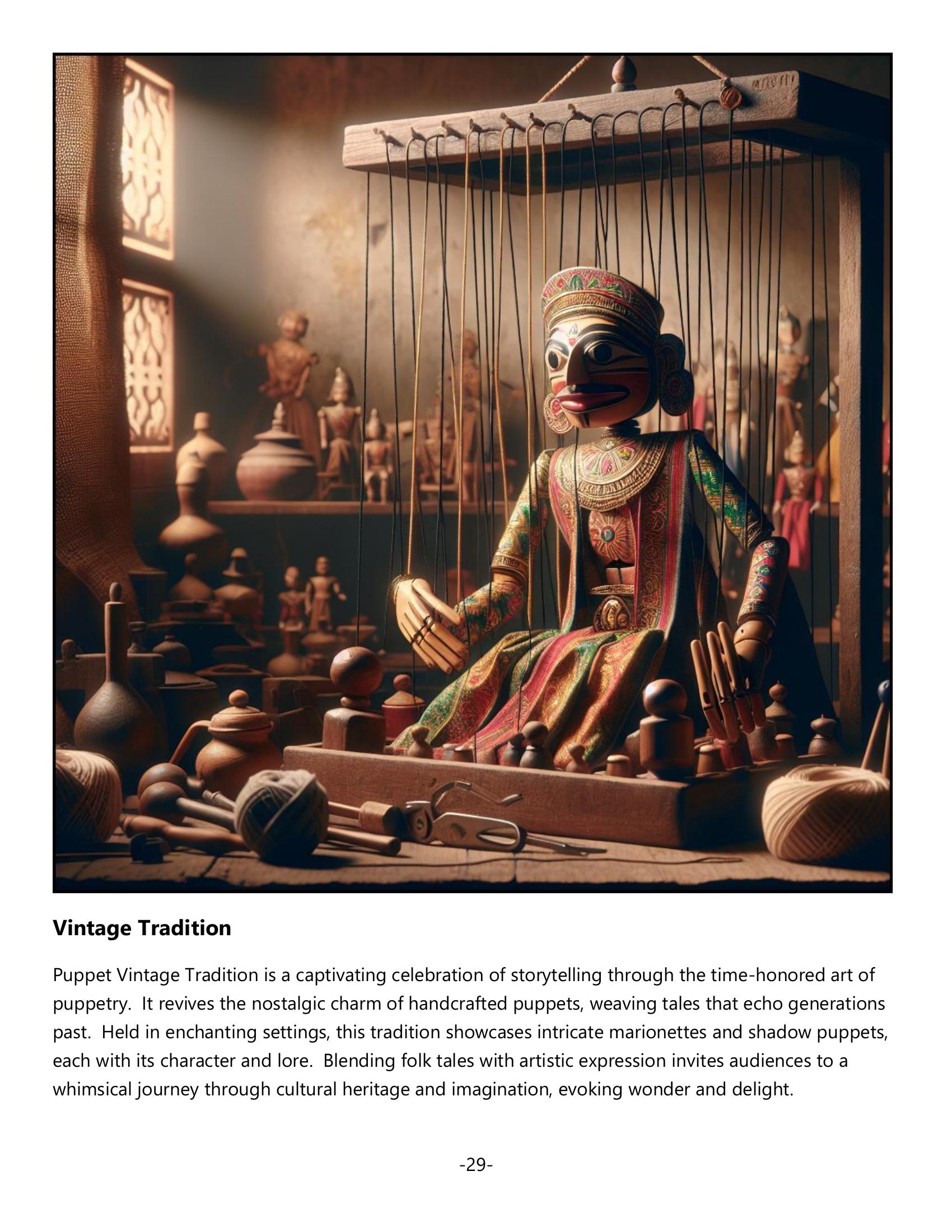 March showcases “Theatrical Illusion,” bringing wooden companions alive, and April introduces “Whimsical Characters,” whose animated charms echo laughter through time. Summer arrives with “Animated Charm,” each puppet a “Craftsmanship Marvel,” celebrating human ingenuity. As autumn leaves fall, the “Playful Entertainer” delights joyfully in “Vintage Tradition.”