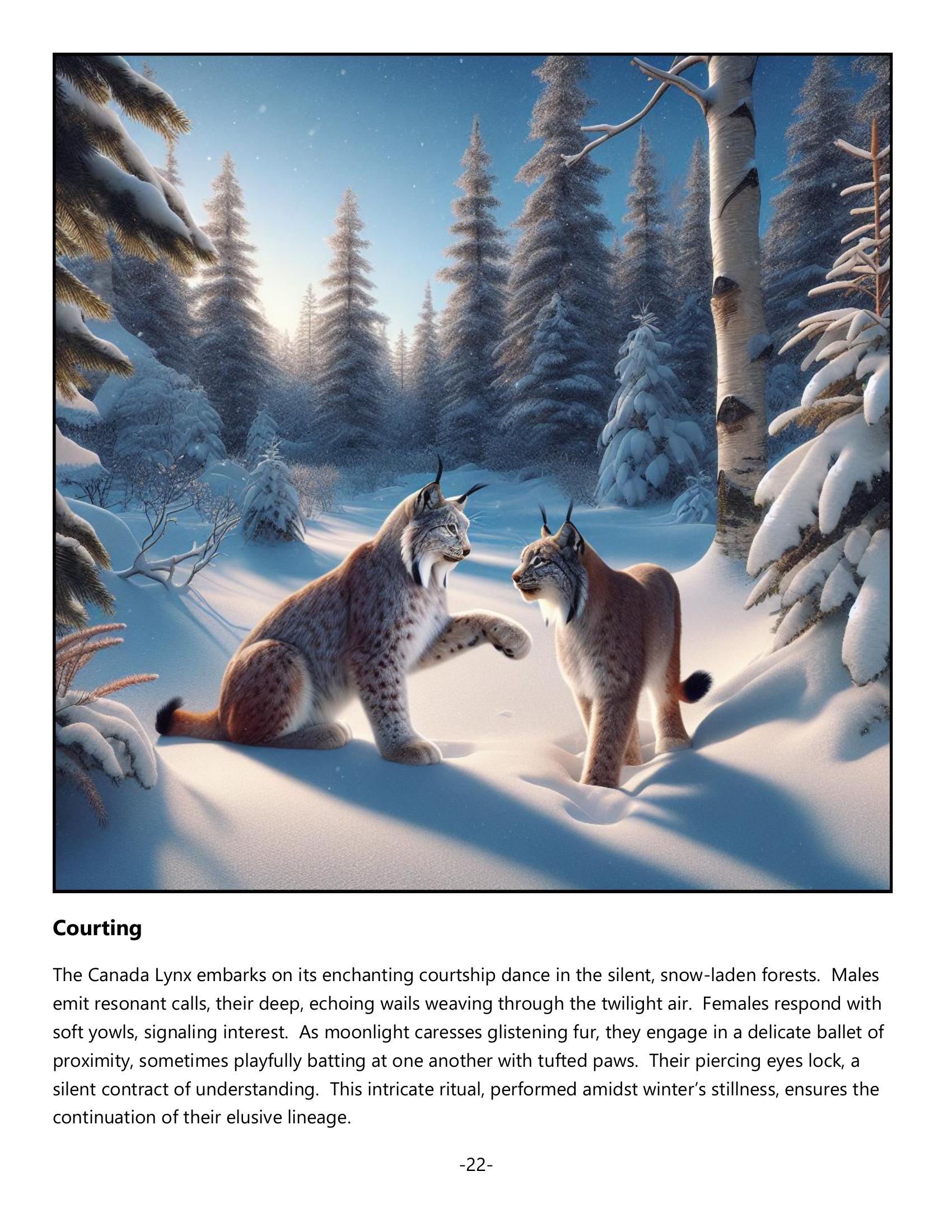 Explore the mysterious world of the Canada Lynx—a mesmerizing feline of North America’s boreal forests. With its silvery-brown coat, tufted ears, and natural snowshoe-like paws, the Lynx is perfectly adapted to snowy terrains. A solitary, nocturnal hunter with a taste for snowshoe hares, it plays a crucial role in its ecosystem. Discover the challenges it faces from habitat loss and climate change. Ideal for nature lovers, educators, and conservationists, this book inspires and enlightens about preserving this emblem of wild beauty.