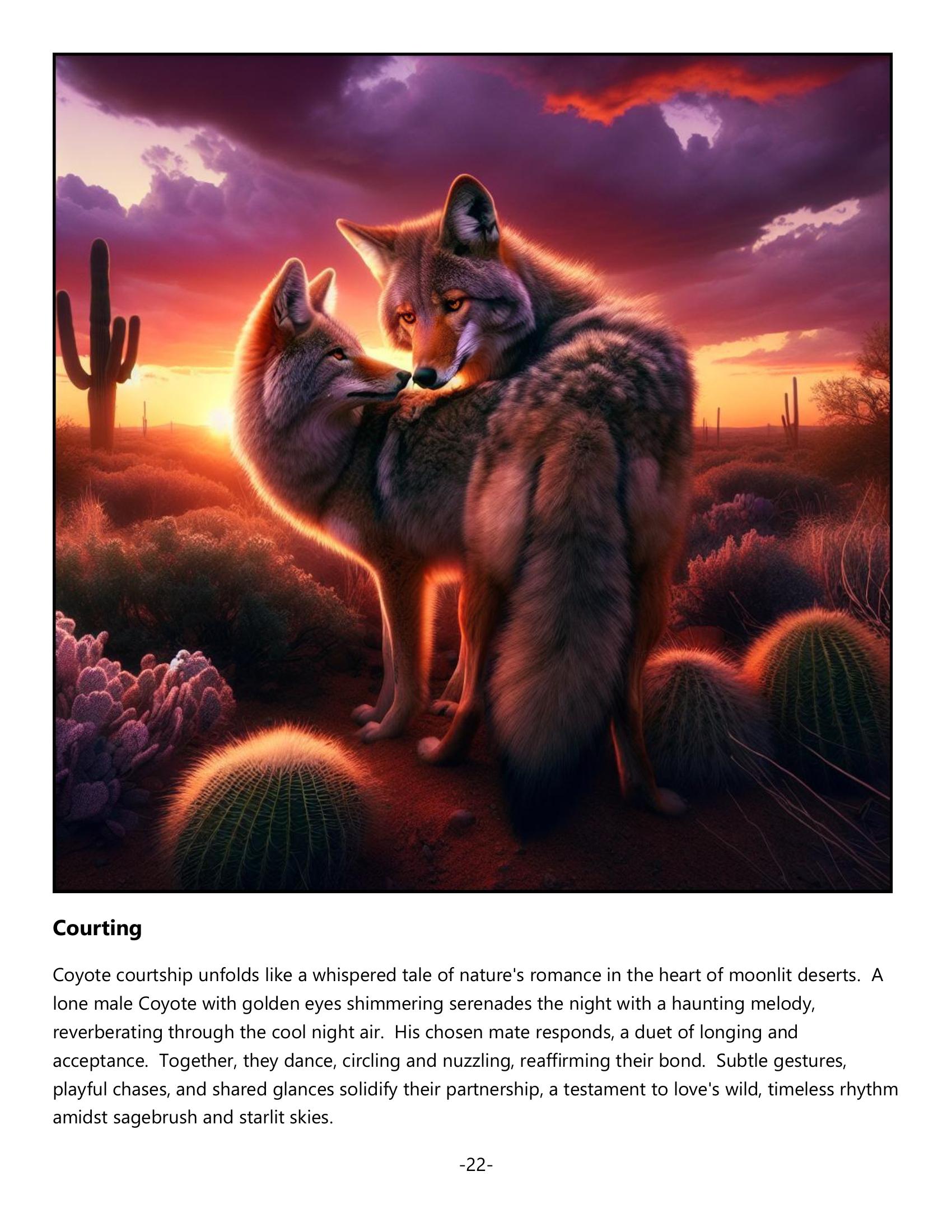 In North America’s wilderness, the Coyote (Canis latrans) is an emblem of adaptability and survival. Often overshadowed by the gray wolf, this resourceful canid thrives in deserts, forests, and urban sprawls. Coyotes vanish into their surroundings with their mottled coats, communicating through a symphony of howls and yips. As keen omnivores, they dine on rodents, fruits, and more, thriving where others cannot. This book offers a rich exploration for nature lovers, ecologists, and creatives, unveiling the Coyote’s resilience and intricate role in the tapestry of life.