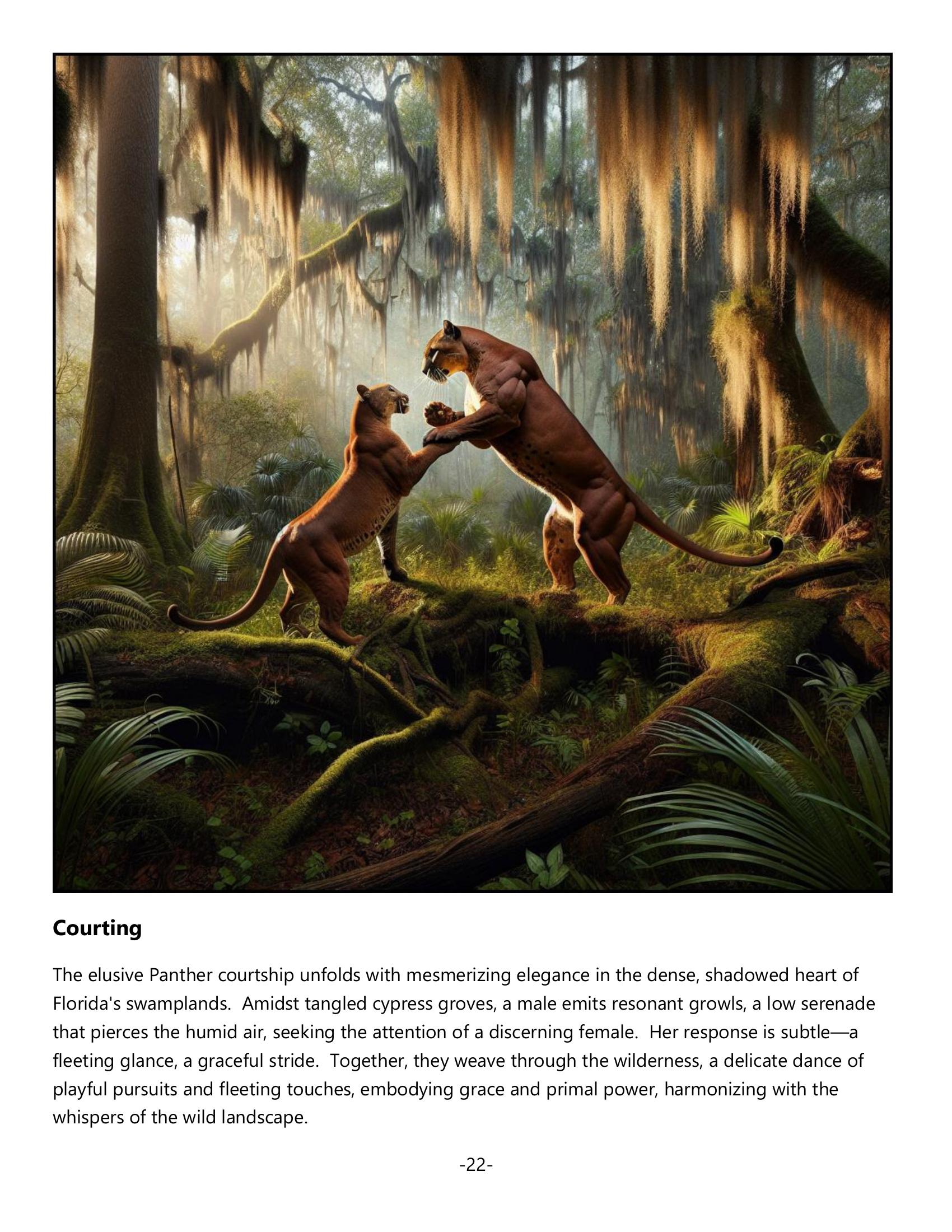 The Florida Panther, a symbol of wild Florida, captivates with its mystique and beauty. As the only cougar east of the Mississippi, these majestic cats faced near extinction due to habitat loss and other threats. Distinct with their tawny coats and smaller size, they roam the swamps, requiring vast territories. Thanks to dedicated conservation efforts, their population is rebounding. This book offers readers—from wildlife enthusiasts to educators—a compelling journey into their world, highlighting the challenges and successes of preserving this crucial piece of Florida’s natural heritage.