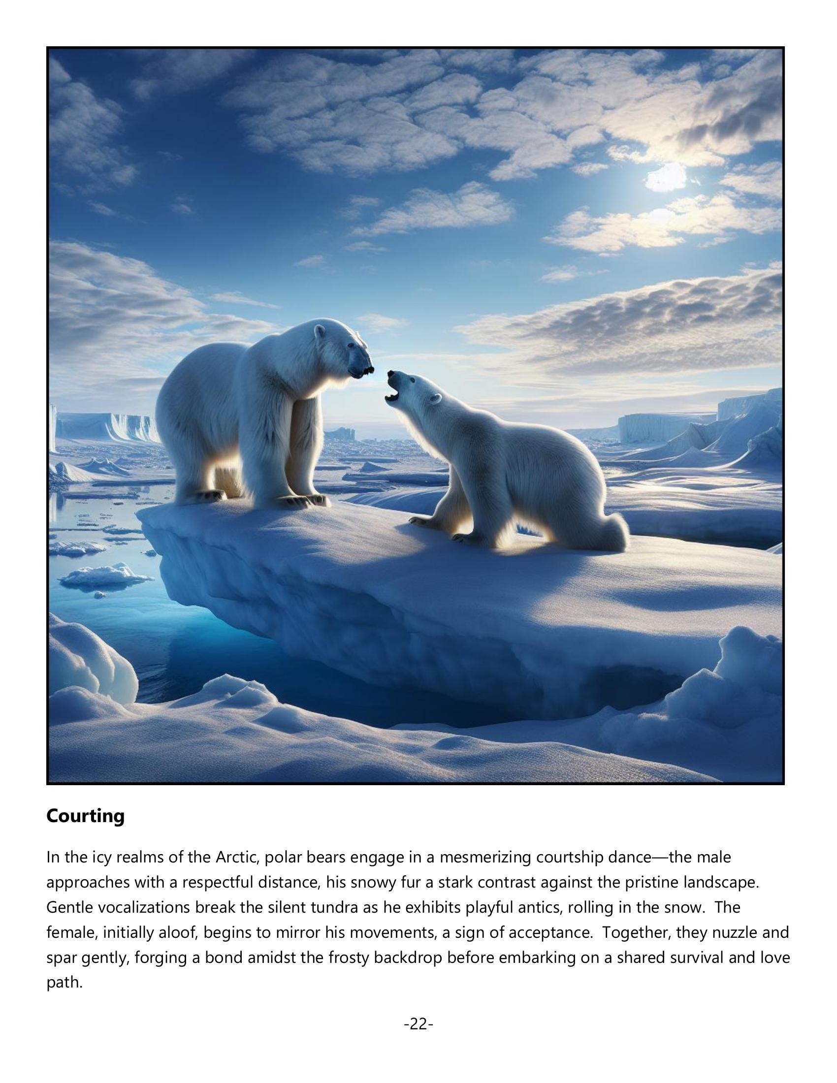 The polar bear, a symbol of Arctic beauty, reigns as the largest land carnivore, mastering survival in extreme cold. Its white fur and insulating fat layer perfectly suit icy habitats. Polar bears hunt seals with patience and swim vast distances thanks to partially webbed paws. Yet, climate change endangers their existence by shrinking ice habitats. A book on polar bears invites readers—wildlife enthusiasts, students, and conservationists alike—into their icy world, emphasizing the urgent need for conservation through captivating stories and stunning visuals.