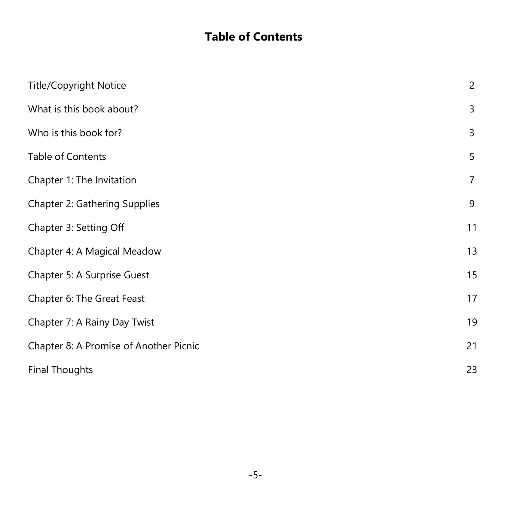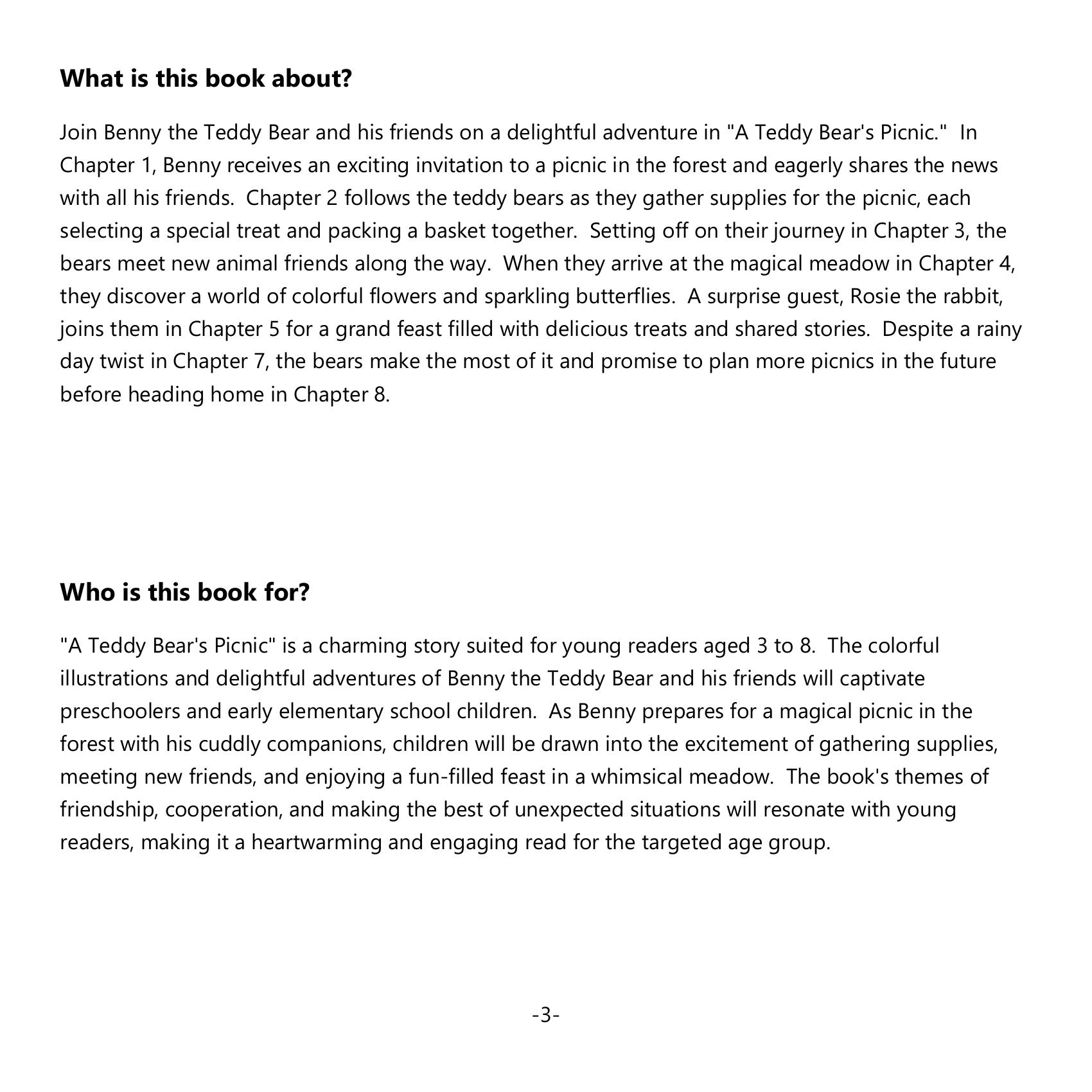 Embark on an enchanting journey with Benny the Teddy Bear and his cuddly friends in “A Teddy Bear’s Picnic.” In the opening chapter, Benny receives an intriguing invitation to a forest picnic and can’t wait to share the news with his pals. Chapter 2 captures the excitement as the teddies gather supplies, each choosing a favorite treat for their picnic basket. Their adventure begins in Chapter 3, where they make new animal friends along the path. Upon reaching a magical meadow in Chapter 4, they’re greeted by vibrant flowers and dazzling butterflies. Rosie the Rabbit, a surprise guest, joins them in Chapter 5 for a feast brimming with delicious goodies and tales. Chapter 7 throws in a rainy day twist, but the undeterred bears promise future picnics as they wrap up their day in Chapter 8.