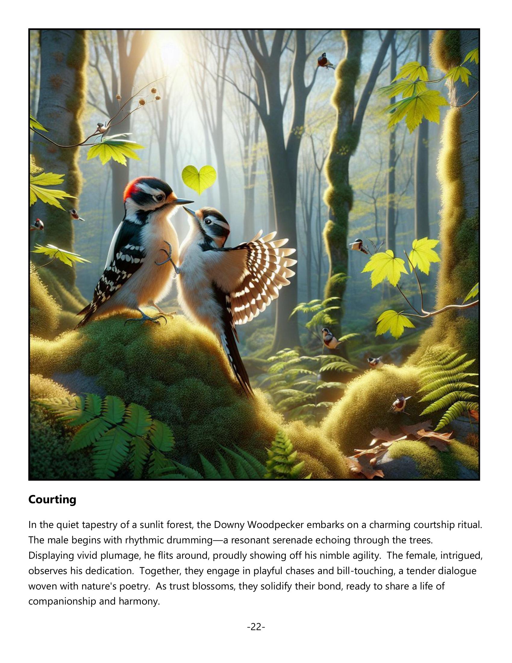 Rich in natural history, the book meticulously details Downy’s role in maintaining ecosystem balance, controlling insect populations, and creating habitats for other species. Readers also gain intimate insights into the woodpecker’s social behaviors and nesting rituals, fostering a holistic understanding of its existence.
