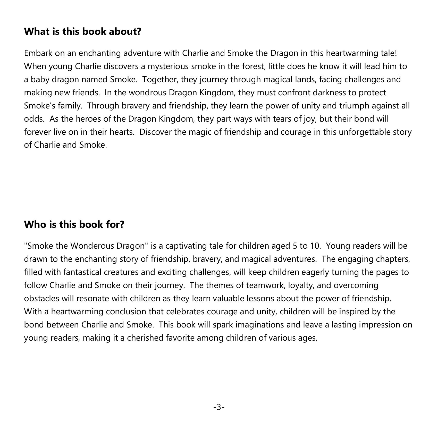Join Charlie on a spellbinding journey with Smoke the Dragon in this heartwarming tale of friendship and adventure! When young Charlie stumbles upon a mysterious smoke in the forest, he discovers a baby dragon named Smoke. Together, they traverse magical realms, braving challenges and forming new friendships. In the mystical Dragon Kingdom, they stand united against looming darkness to protect Smoke’s family. Their courageous exploits teach them the power of unity and triumph over adversity. As champions of the Dragon Kingdom, they part ways with joyful tears, their unbreakable bond forever etched in their hearts. Dive into this unforgettable story filled with magic and courage, celebrating the enchanting friendship between Charlie and Smoke.