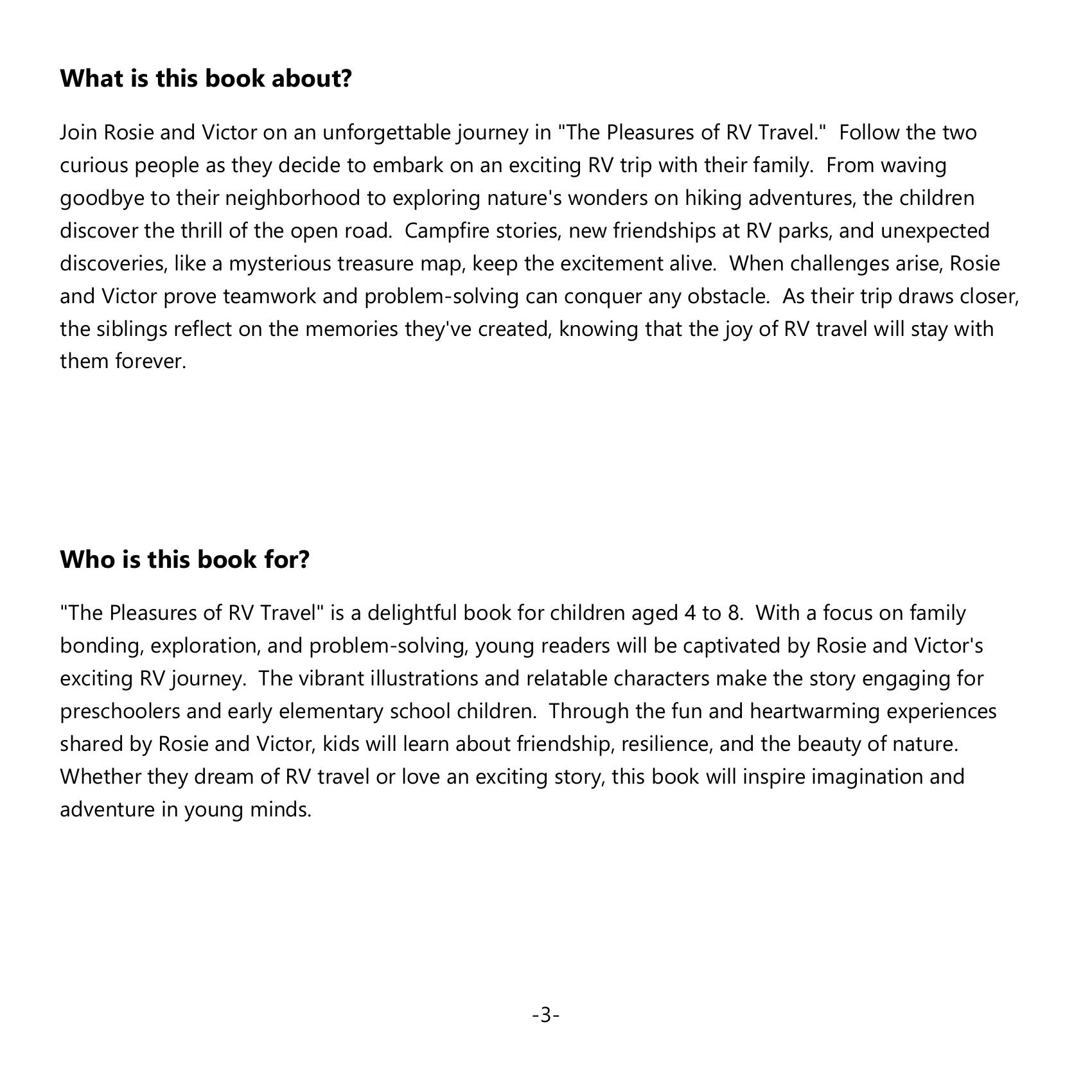 Join Rosie and Victor on a captivating adventure in “The Pleasures of RV Travel.” This enchanting tale invites children aged 4 to 8 to explore the thrill of the open road. From heartfelt goodbyes to neighborhood streets to the wonders of nature on exciting hikes, youngsters experience the magic of RV life. Warm campfire tales, friendships at RV parks, and a mysterious treasure map add to the excitement. With lively illustrations, this book showcases family bonding, resilience, and the beauty of friendship, sparking the imagination and love for exploration.