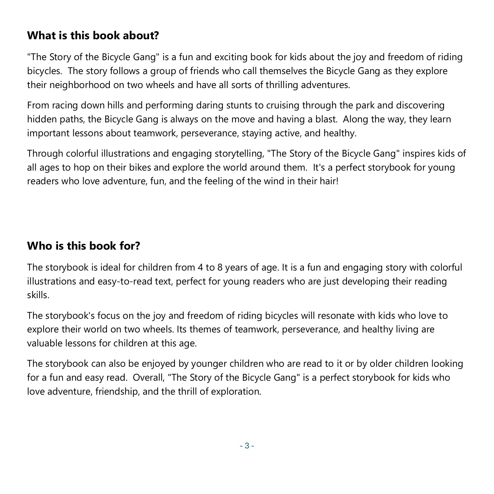 “The Story of the Bicycle Gang” invites young adventurers on a whimsical journey through the open streets of their imagination. Crafted with the wonder of childhood in mind, this delightful book captures the exhilarating freedom of zooming around on two wheels. Perfectly suited for curious children aged 4 to 8, the story revolves around a spirited band of friends who proudly name themselves the Bicycle Crew. This dynamic group embarks on heart-pounding adventures, discovering hidden corners of their neighborhood and unlocking the secrets of their world, one pedal at a time.